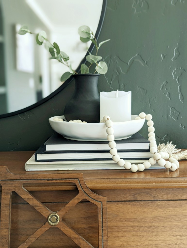 4. Shapes. Use different shapes. You get round with the beads and candle, sharp corners with the book, and curves with the bowl and vase.