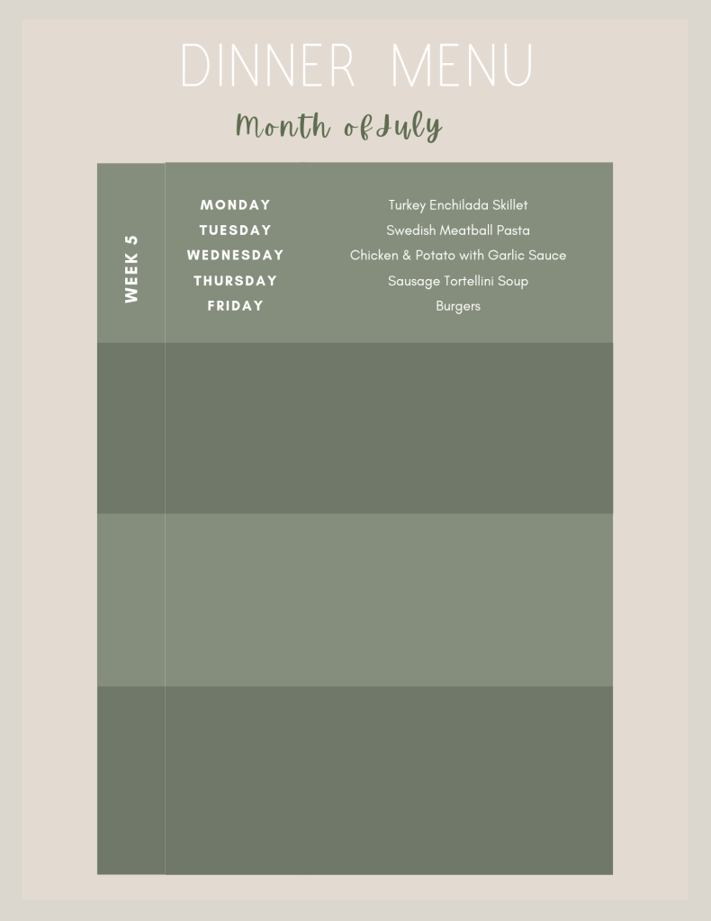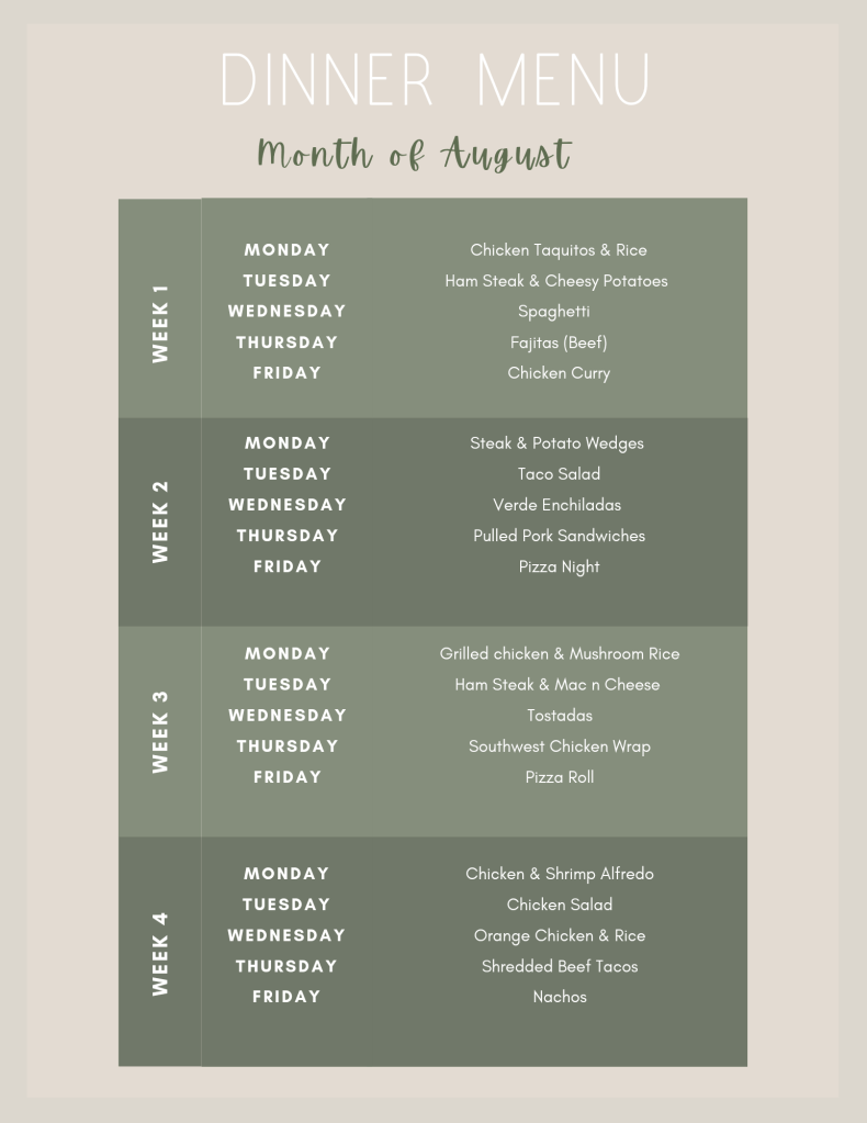 August Dinner Menu Posted byStephany RiosAugust 1, 2023July 22, 2024Posted inFamily RecipesTags:dinner, dinner menu, family, house, life, meal plan, meals, menu, recipes Share this: Click to share on X (Opens in new window) X Click to share on Facebook (Opens in new window) Facebook Like Loading... Related