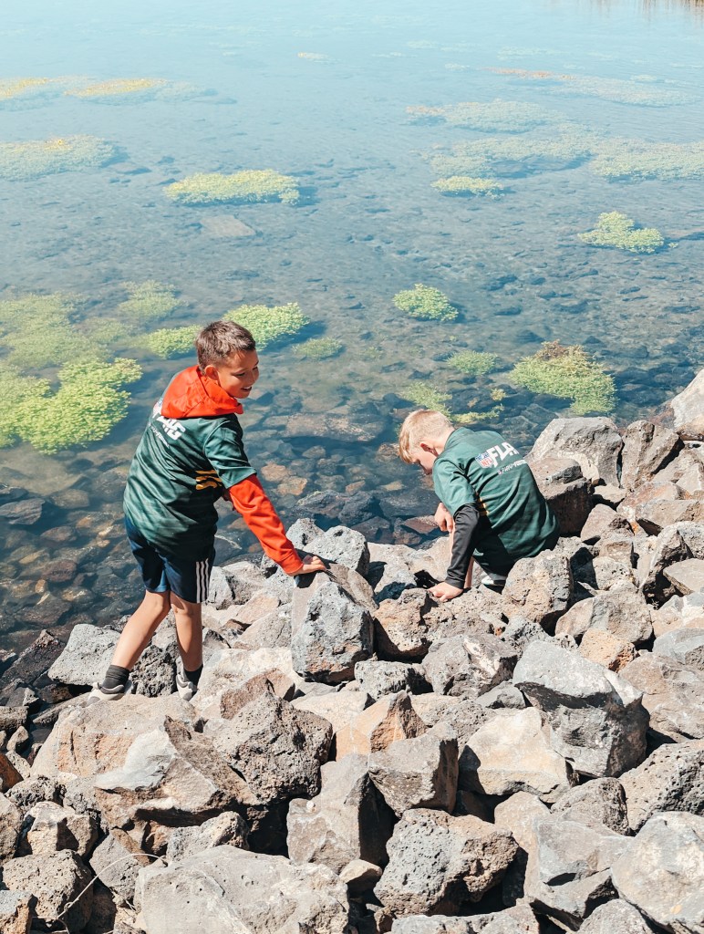 I would highly recommend making a stop here! There is a short walk to the falls. You could easily take a stroller on the path. There is just this shallow pool at the base of the falls, with 6 kids in tow, I loved that there was no swift rushing water. Up the path and past the falls a little bit there are piles of black lava rock next to the little river that runs along the path. To the kids surprise, there were all kids of reptiles to be found! Lizards, toads and water snakes provided for nearly an hour of entertainment.