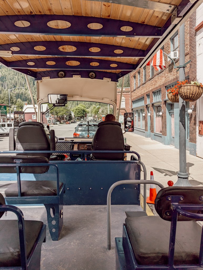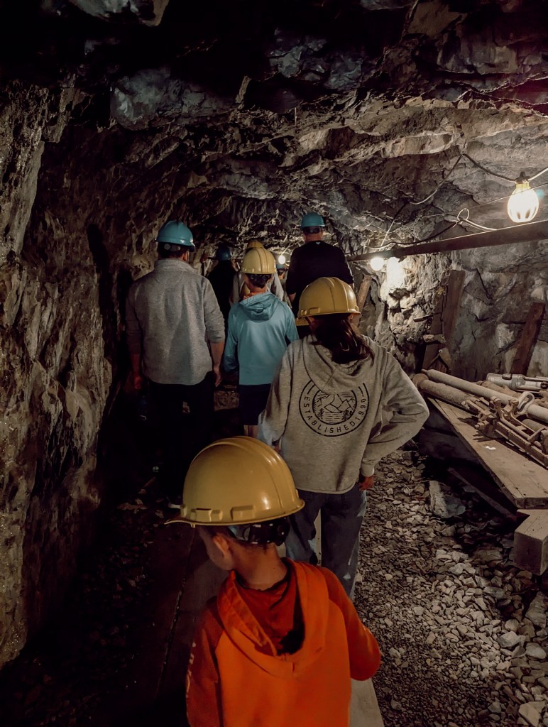 It starts at a cute gift shop/ ice cream parlor down town. You get onto this trolly and take a guided tour through town. Emelia was chosen to be the trolly “navigator.” So she got to ride in the front passenger seat. The rest of us were here in the back together. The trolley is open, if you go in the morning like we did, you may want a jacket as the breeze picks up with the speed. The tour guide was amazing. As he weaves in and out of the streets he gives the history of the town. After about 15 minutes you will arrive at the mine site.
