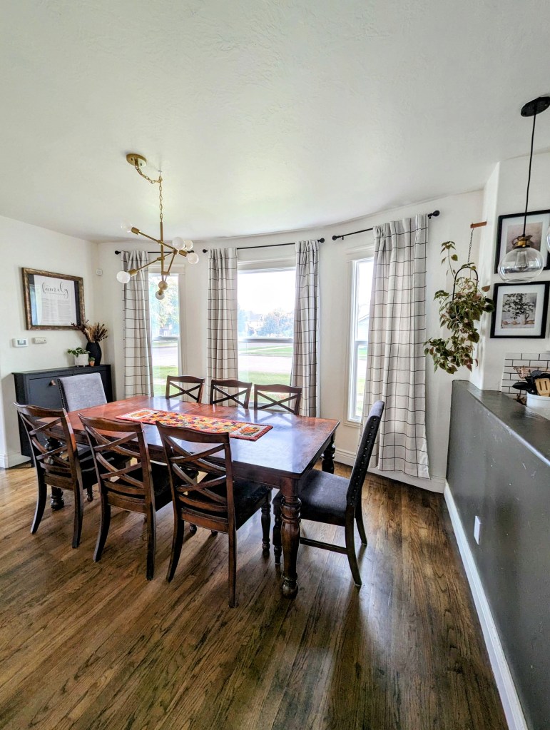 Now, we homeschool around our dining room table. This setup works well for us: there’s enough room for everyone to spread out with books and computers, and the central location allows me to manage household tasks alongside teaching. Whether I’m switching laundry, prepping dinner, or spending time with a toddler, we’re all together but have our own space.