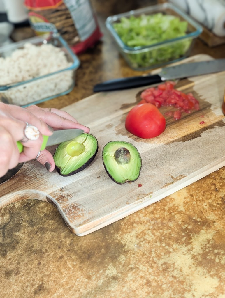 - Top with shredded chicken, cheese, lettuce, tomatoes, onion, and avocado.